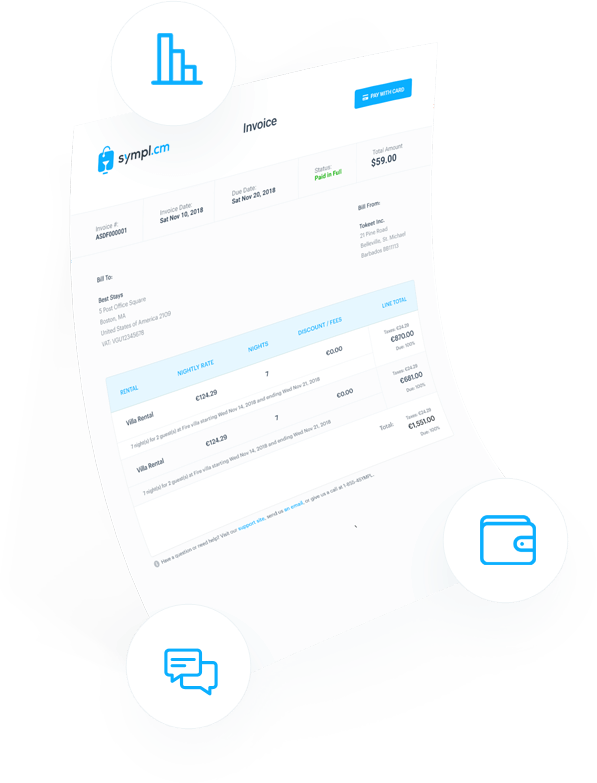 Sympl es un sistema integral de gestión de propiedades que te permite administrar todas tus reservas y propiedades. Envía facturas con un solo clic y acepta pagos con tarjeta de crédito directamente en línea. Sympl centraliza la comunicación con tus huéspedes y te permite controlar los gastos, generar informes y mucho más. Con Sympl, gestionar tus alquileres es muy sencillo.